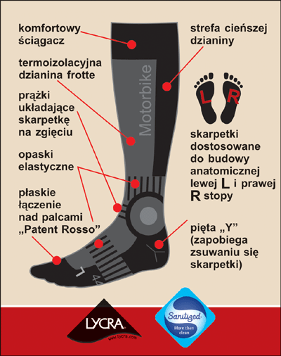 Konstrukcja i wykończenie: Skarpety motocyklowe z trójwarstwowego, profilowanego frotte, chroniącego części nogi narażone na urazy i otarcia. Miejsca narażone podczas jazdy na intensywne chłodzenie są chronione przez pogrubioną, ocieplającą dzianinę. Lycra w całym wyrobie zapewnia idealne przyleganie do nóg. Komfortowy ściągacz nie powoduje nadmiernego ucisku, utrzymując doskonale podkolanówkę na nodze. Dwie opaski elastyczne, na śródstopiu i nad kostką, zapobiegają przesuwaniu się podkolanówek nawet podczas gwałtownych ruchów. Podkolanówki są dostosowane do anatomicznego kształtu lewej (L) i prawej (P) stopy. Poprzeczne prążki ułatwiają układanie się podkolanówki na zgięciu nogi. Komfortu dopełnia unikalny, płaski szew "Patent Rosso" nad palcami. Wykończenie Sanitized zapewnia wyjątkową higienę - antybakteryjne, antygrzybicze i antyzapachowe działanie podkolanówek. .
